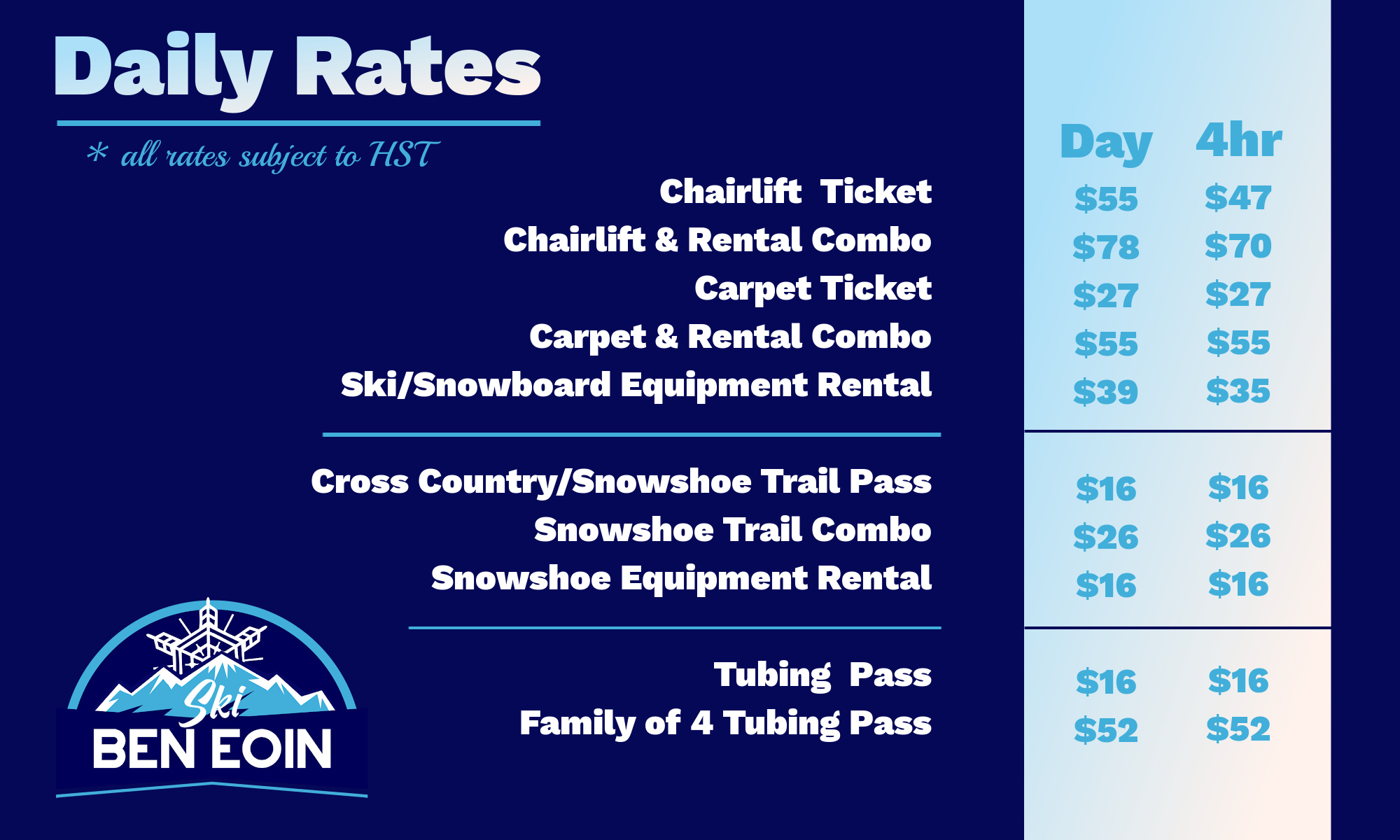 4 hour tickets, rentals and combos can be purchased onsite at Customer Service in the main chalet.